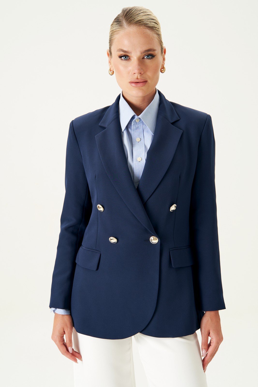 Этот элегантный шерстяной жакет выполнен в классическом темно-синем цвете и подчеркивает строгость и безупречный вкус. Двубортный фасон с блестящими металлическими пуговицами добавляет образу утонченности, сохраняя при этом деловую эстетику. Приталенный крой выгодно подчеркивает силуэт, создавая идеальный баланс между комфортом и элегантностью. Этот жакет прекрасно подойдет для офисных встреч, светских мероприятий или деловых поездок, добавляя уверенности и изысканности любому наряду. Жакет женский, свободного полуприлегающего силуэта, выполнен из костюмной полушерстяной ткани, на притачной подкладке, с двубортной застежкой на 2 петли и 4 пуговицы (размер и цвет фурнитуры может незначительно отличаться от фото). Жакет может быть как для нарядной, так и для повседневной носки.