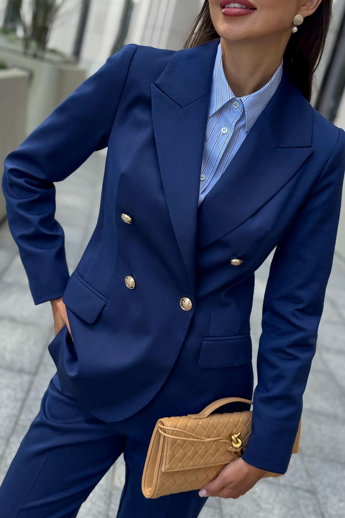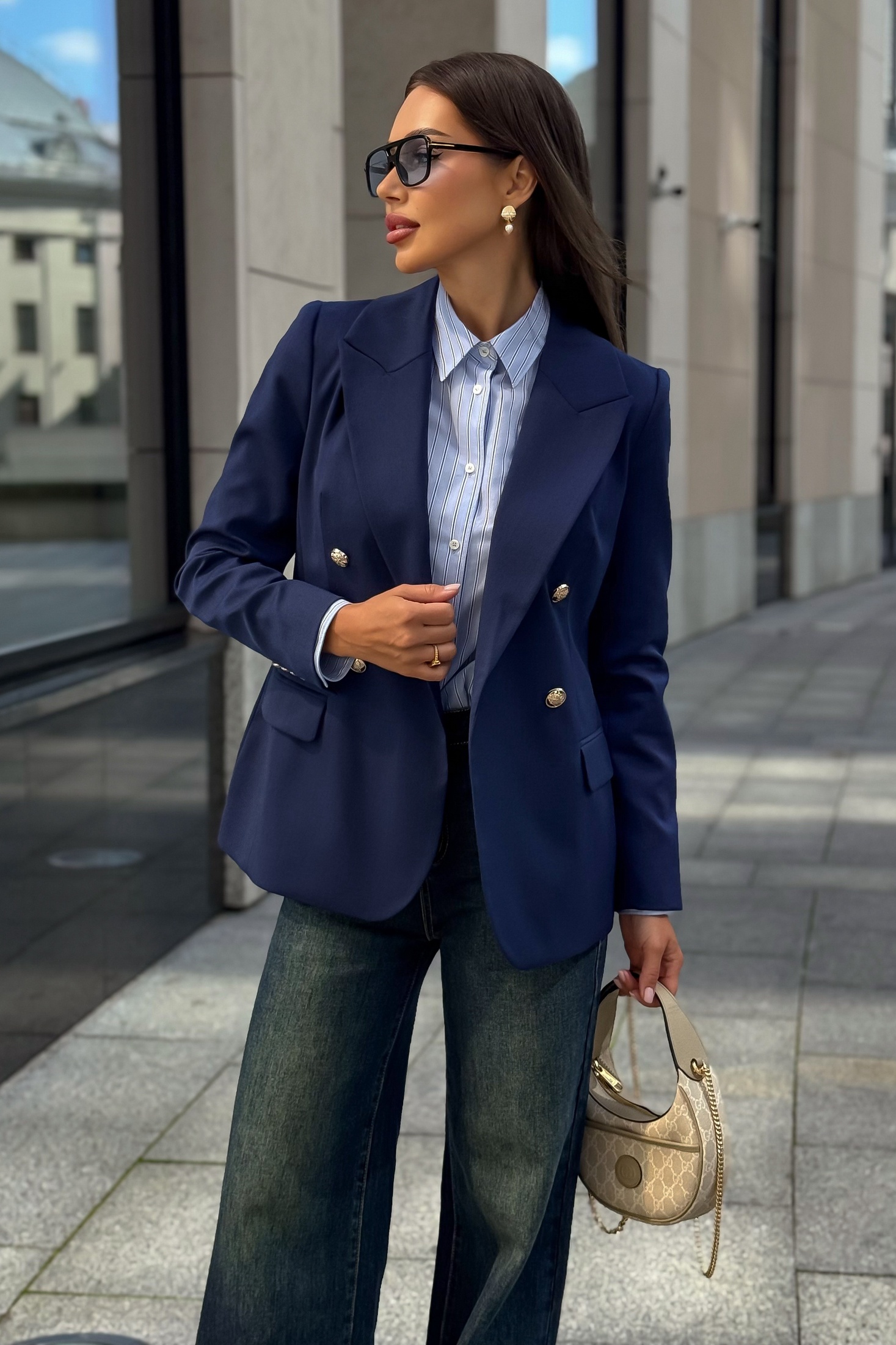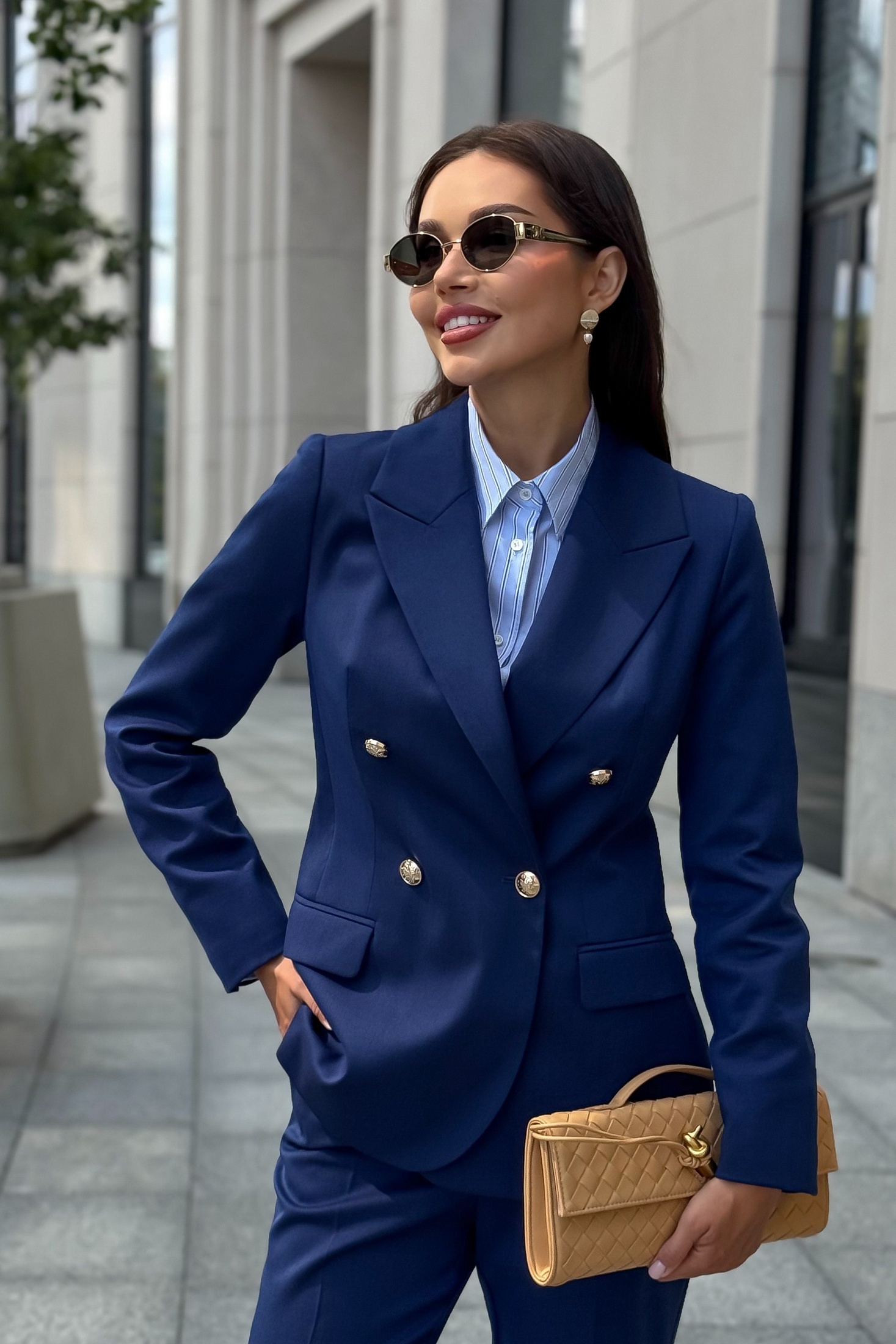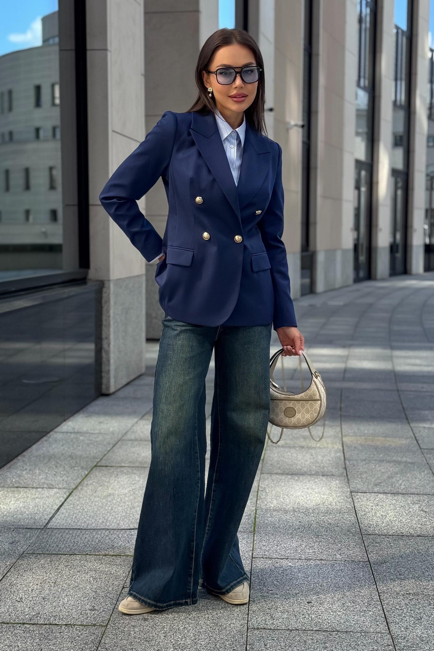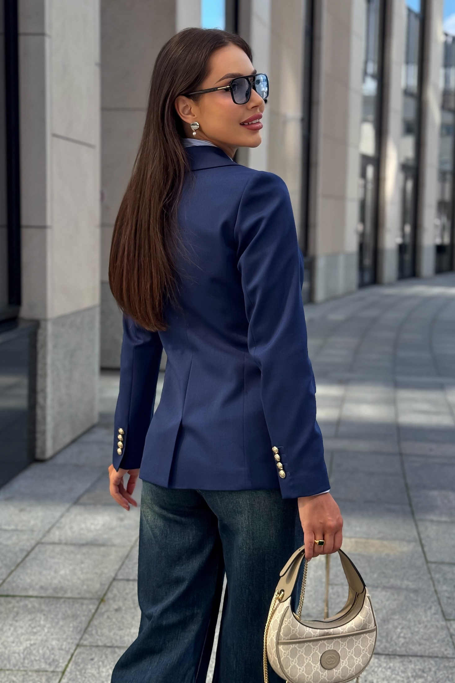 Каждая женщина знает: приталенный женский жакет способен выгодно подчеркнуть фигуру, добавить изящества и уверенности в себе. Синий цвет – это классика, которая никогда не выходит из моды. Такой жакет уместен как в офисе, так и на деловой встрече, на прогулке по городу или в вечернем образе. Жакет женский, полуприлегающего силуэта, выполнен из костюмной ткани, на притачной подкладке, с двубортной застежкой на 2 петли и 4 декоративные пуговицы (размер и цвет фурнитуры может незначительно отличаться от фото), для повседневной носки.