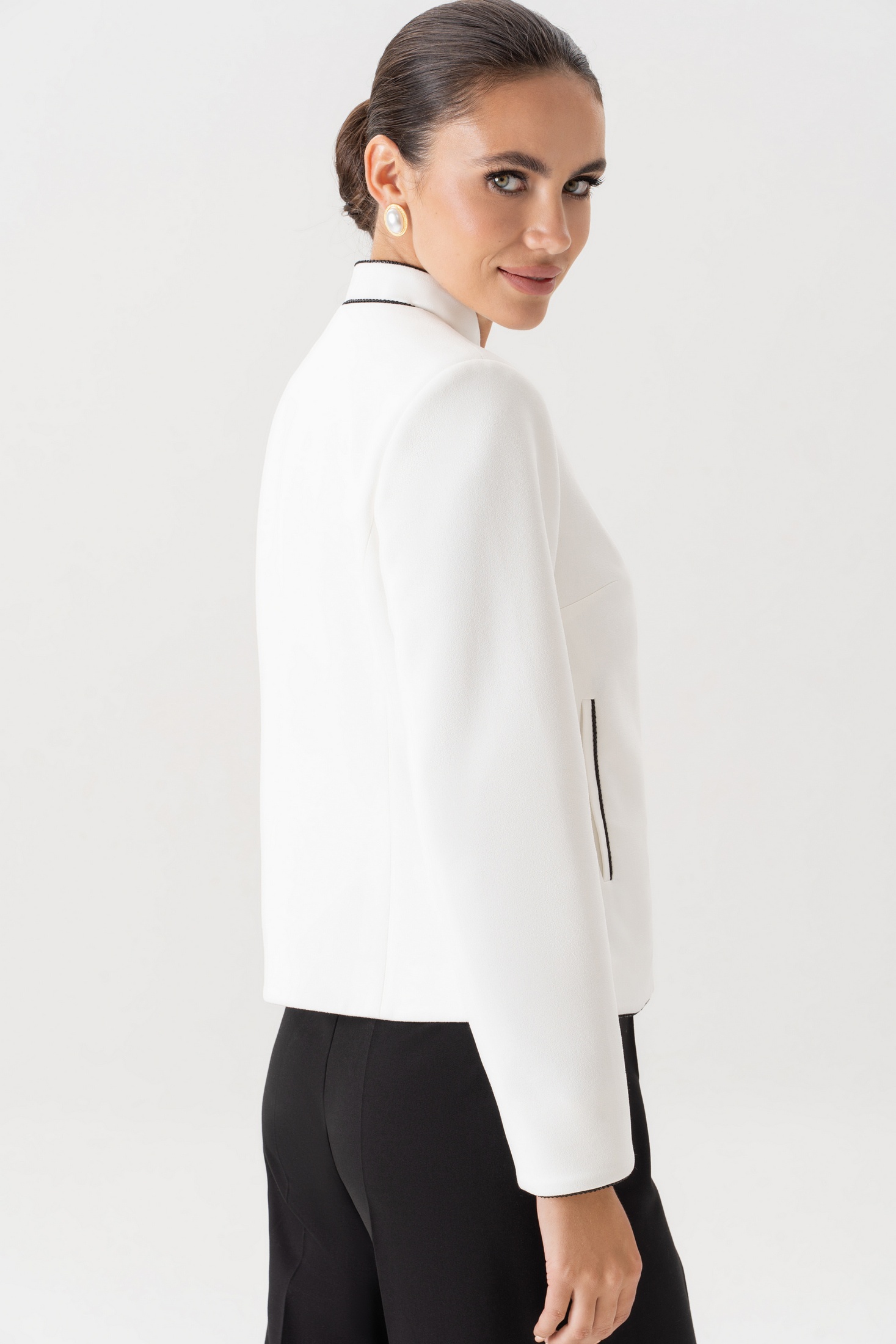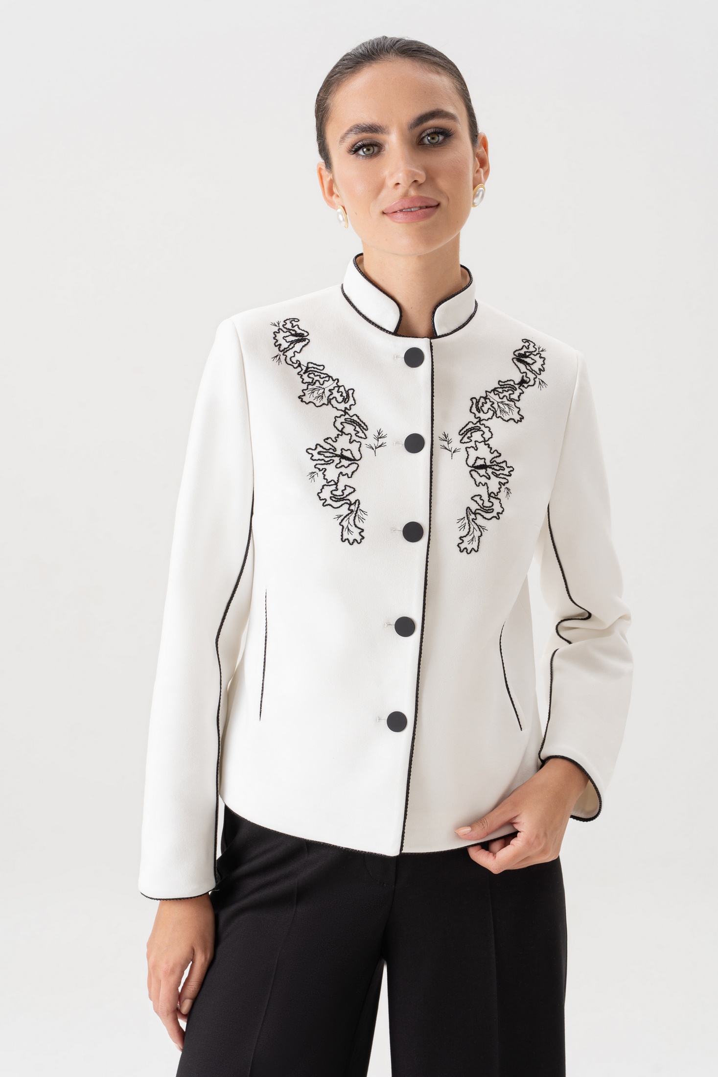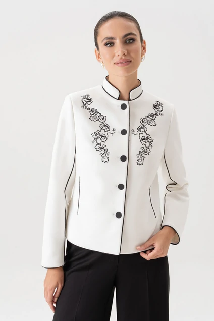 Жакет с центральной бортовой застежкой на 5 петель и пуговиц (фурнитура может незначительно отличаться от фото). По верху жакета выполнена вышивка. Перед с нагрудными вытачками, выходящими из бокового шва и вертикальными карманами с листочкой с отделкой кантом.
