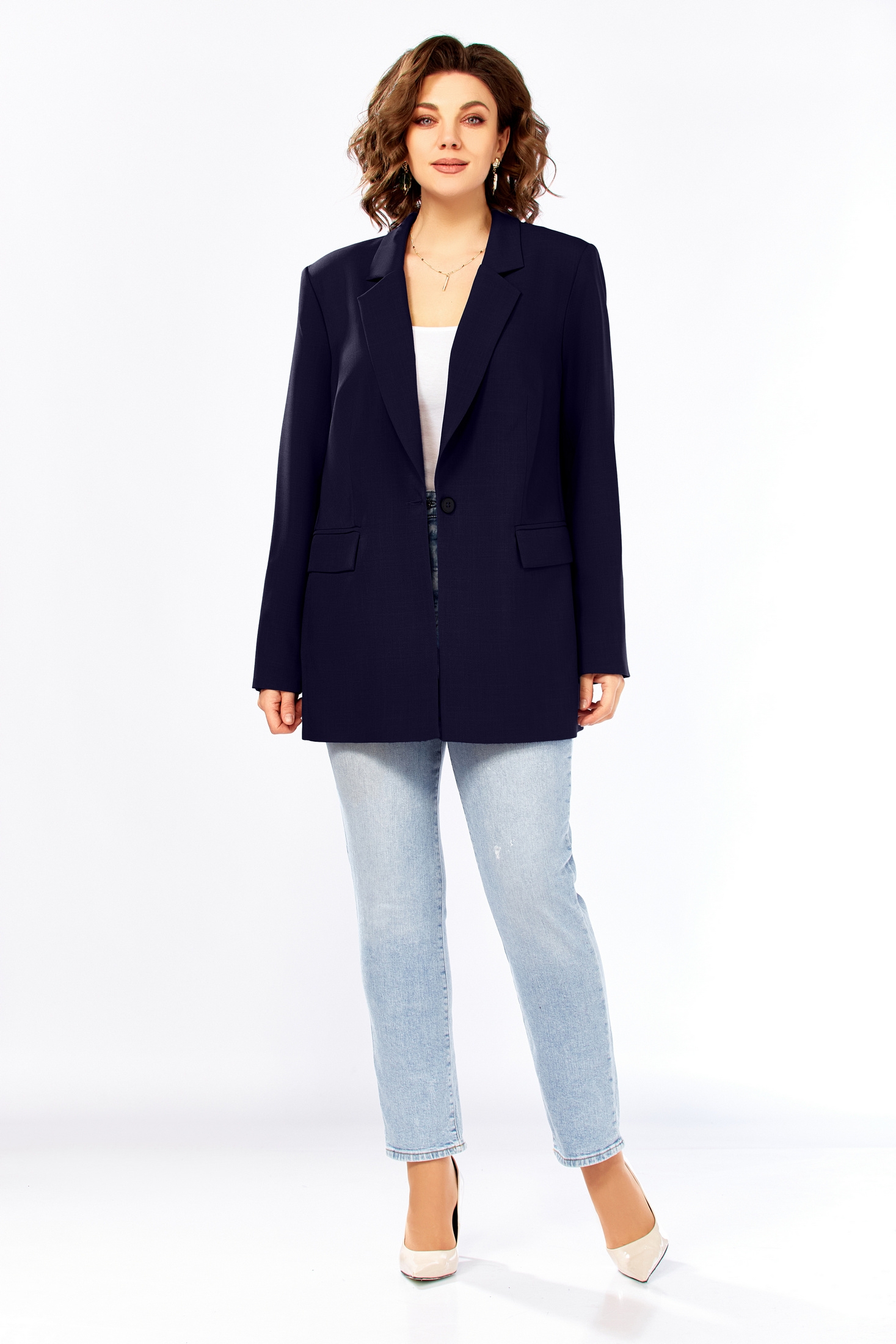 Стильный жакет прямого силуэта с пиджачным воротником, с застежкой на одну пуговицу. По переду карманы клапанами. Рукав длинный двухшовный со шлицей на четыре пуговицы