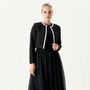 Этот изысканный твидовый жакет станет идеальным акцентом для создания элегантного и женственного образа. Выполненный в классическом черном цвете с фактурной тканью, он дополнен утонченной серебристой отделкой, которая подчеркивает его изысканный стиль. Минималистичный крой с округлым вырезом и укороченная длина делают его универсальным дополнением как к вечернему платью, так и к повседневному ансамблю. Этот жакет подчеркивает тонкий вкус и добавляет нотку роскоши вашему гардеробу. Носите его с элегантными лодочками и минималистичными аксессуарами для завершения образа.