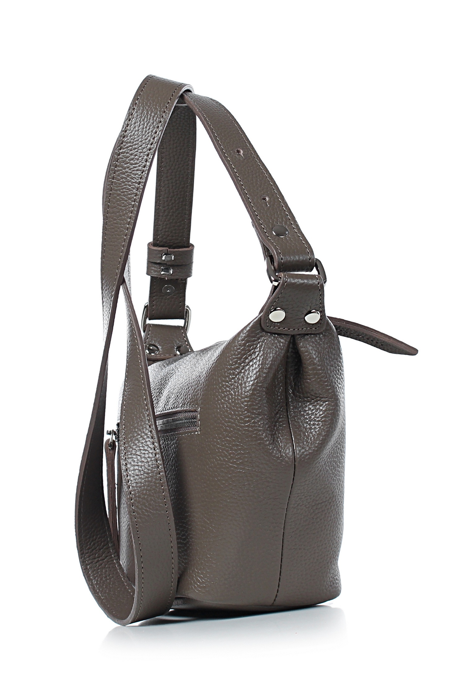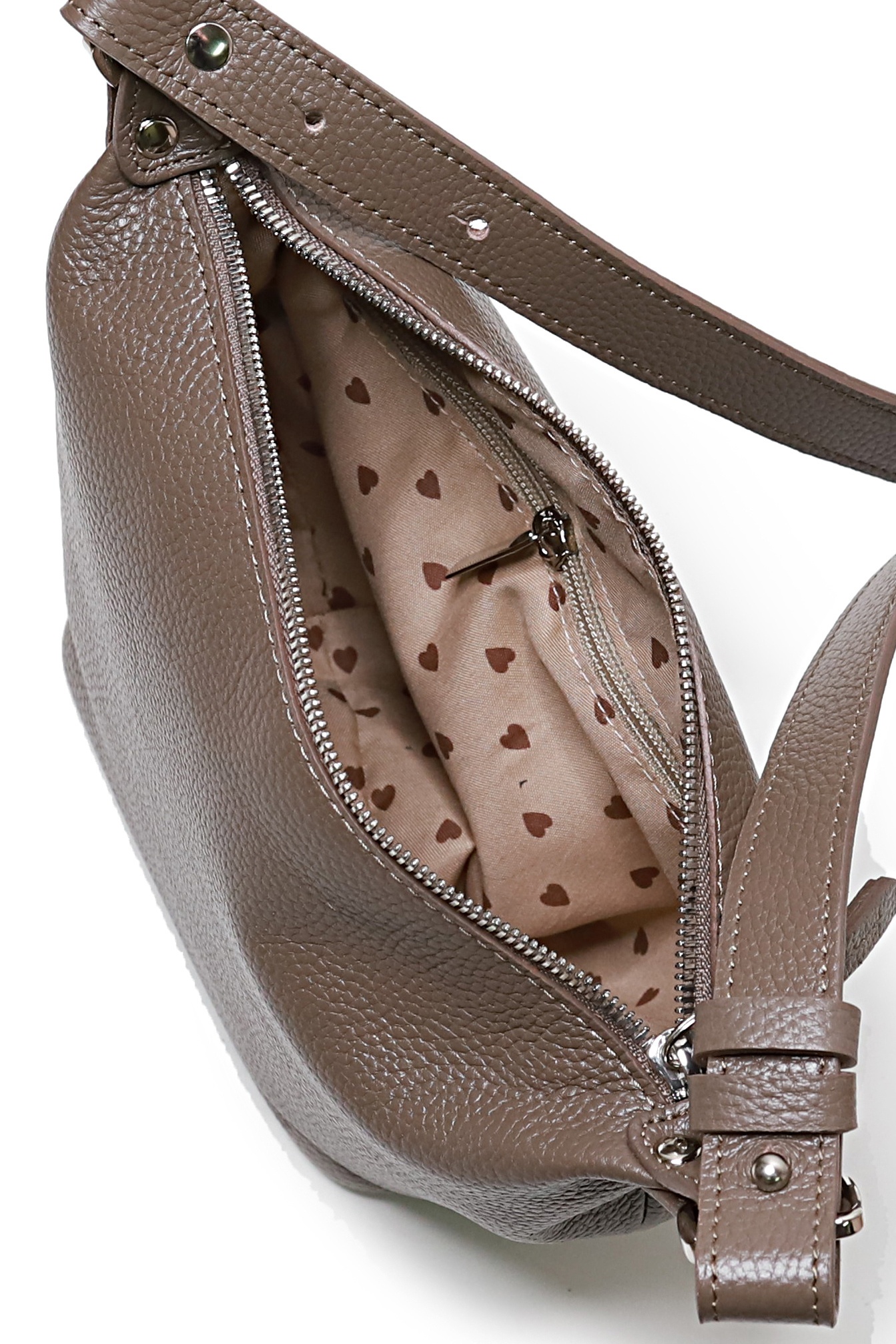 Сумка на одно отделение, закрывающееся на застежку-молнию, с одной регулирующейся ручкой-ремнем максимальной длины 620+-10мм, с двумя шлевками на ручке, с двумя поводками на движках, с карманом на задней стенке, закрывающимся на застежку-молнию. Цвет фурнитуры - никель.Сумка на подкладке, с открытым карманом с украшением, с подвесным карманом, закрывающимся на застежку-молнию.