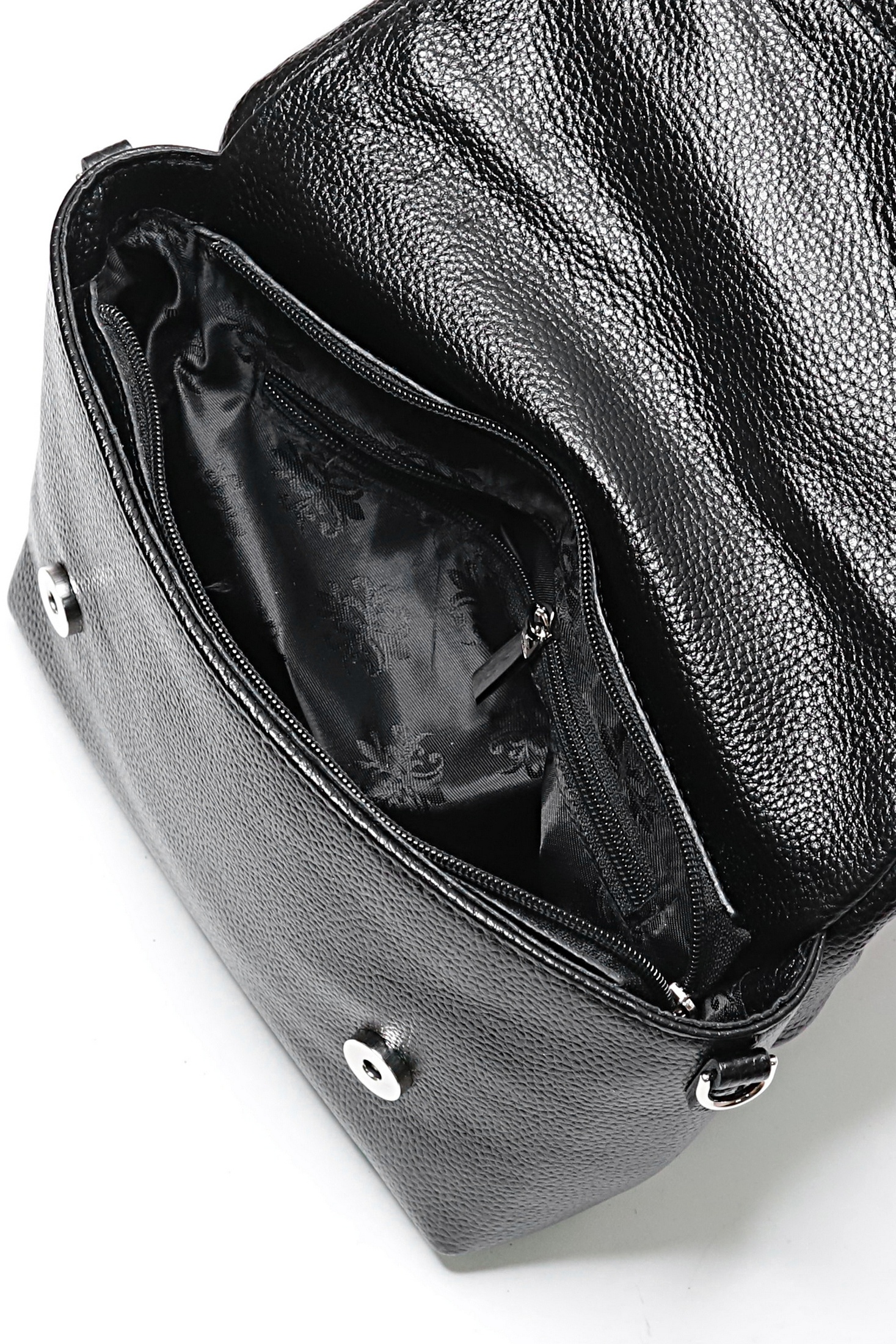 Сумка на одно отделение, закрывающееся на застежку-молнию и клапаном на замок-магнитку, с одной короткой ручкой длиной 320+-10мм, со съемной регулирующейся ручкой-ремнем максимальной длины 1210+-10мм, на задней стенке карман, закрывающийся на застежку-молнию, с боковыми держателями. Цвет фурнитуры - никель.
