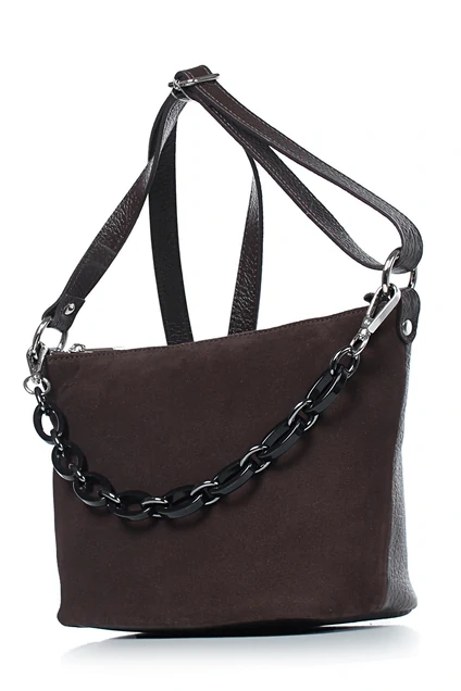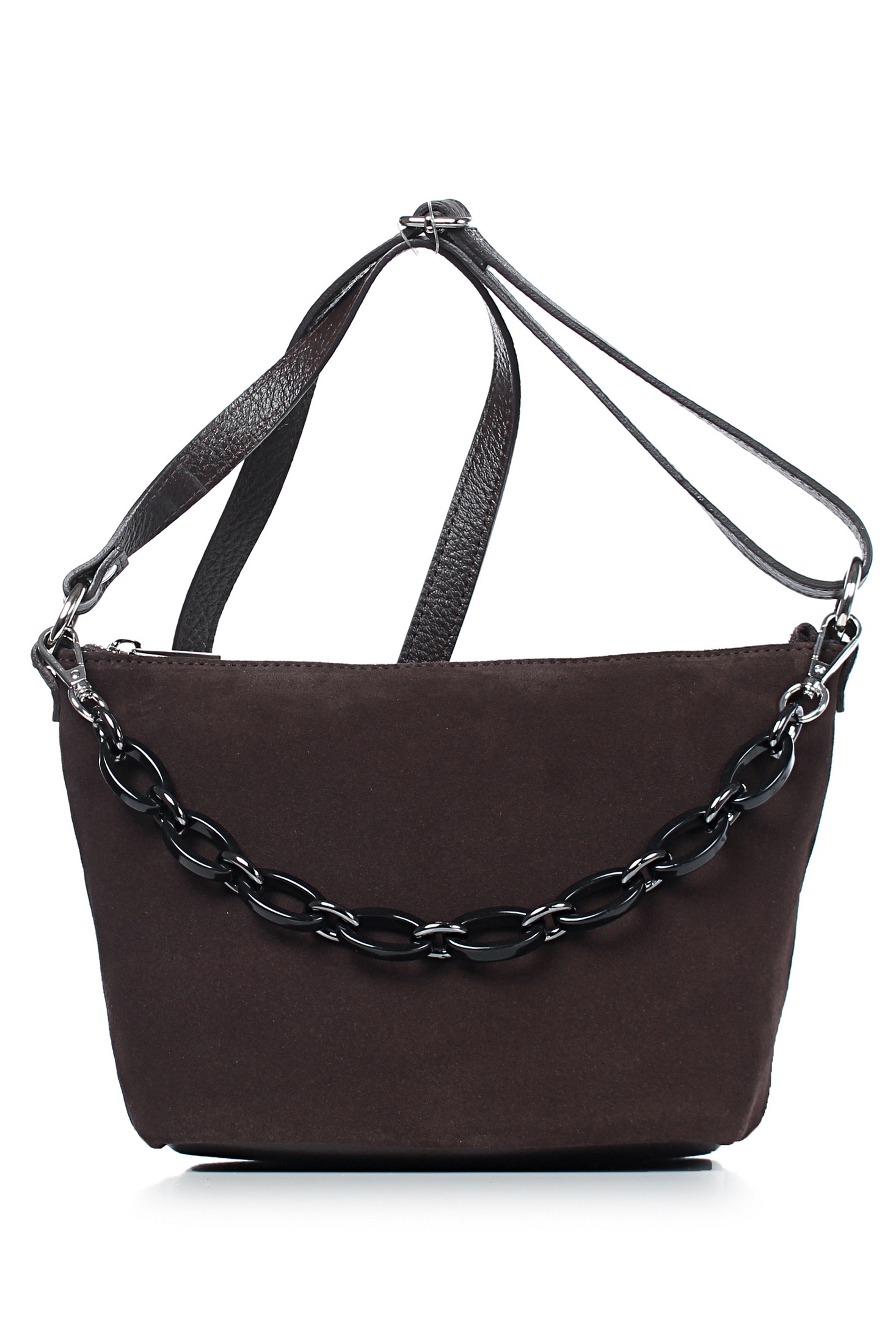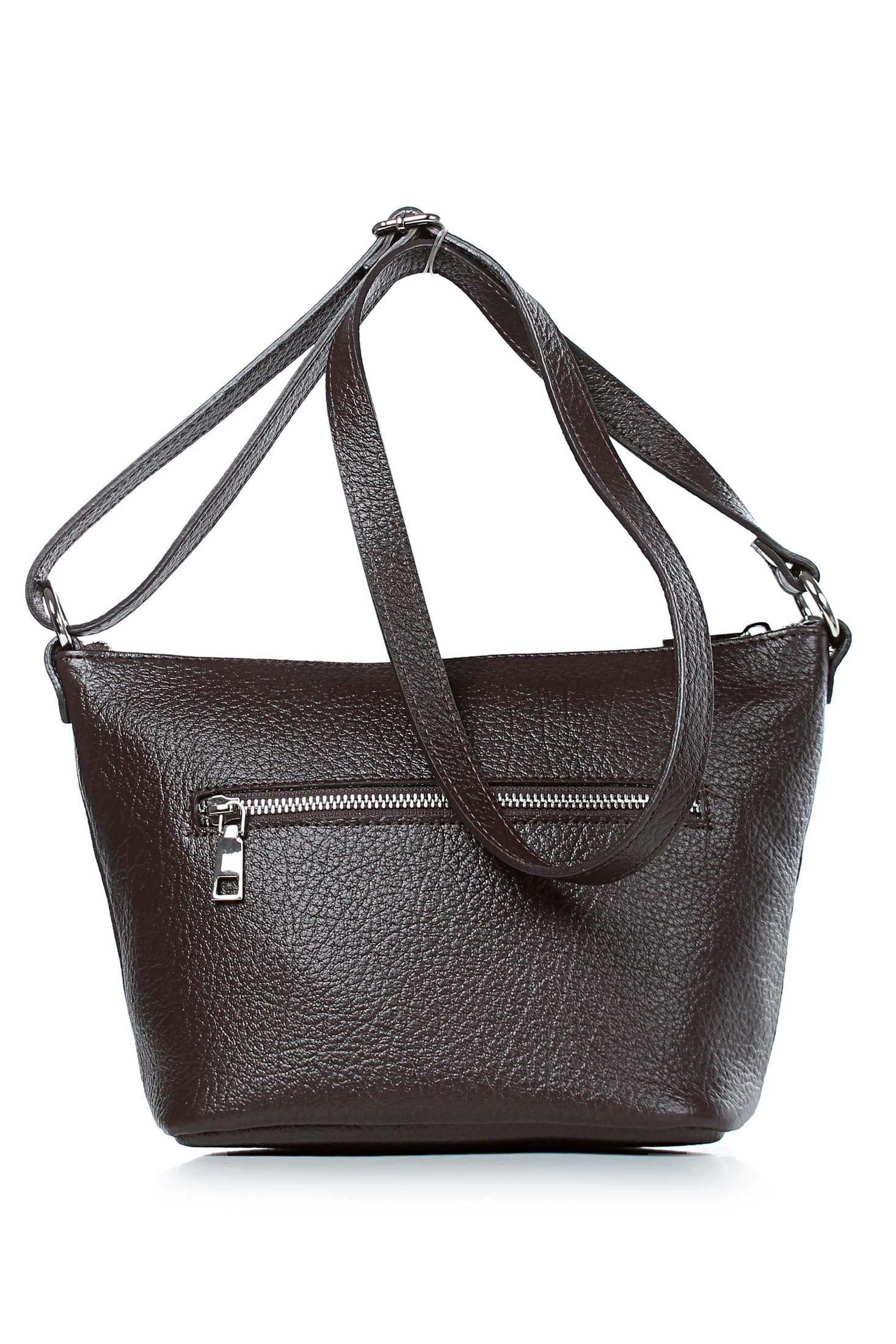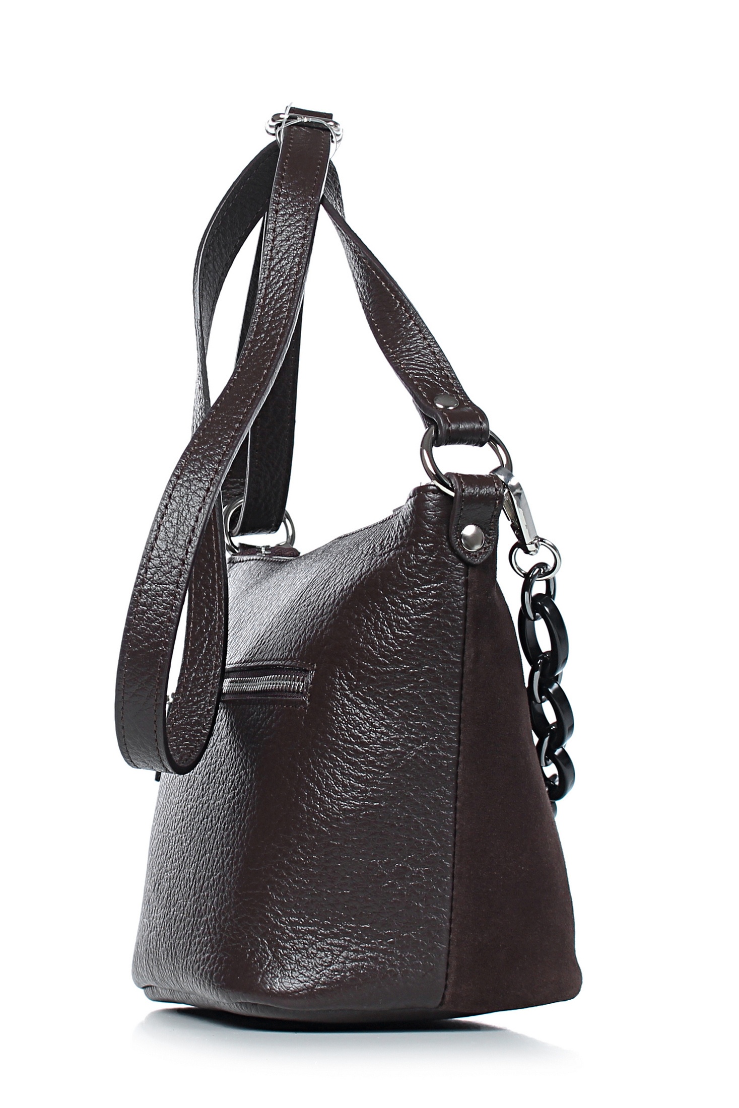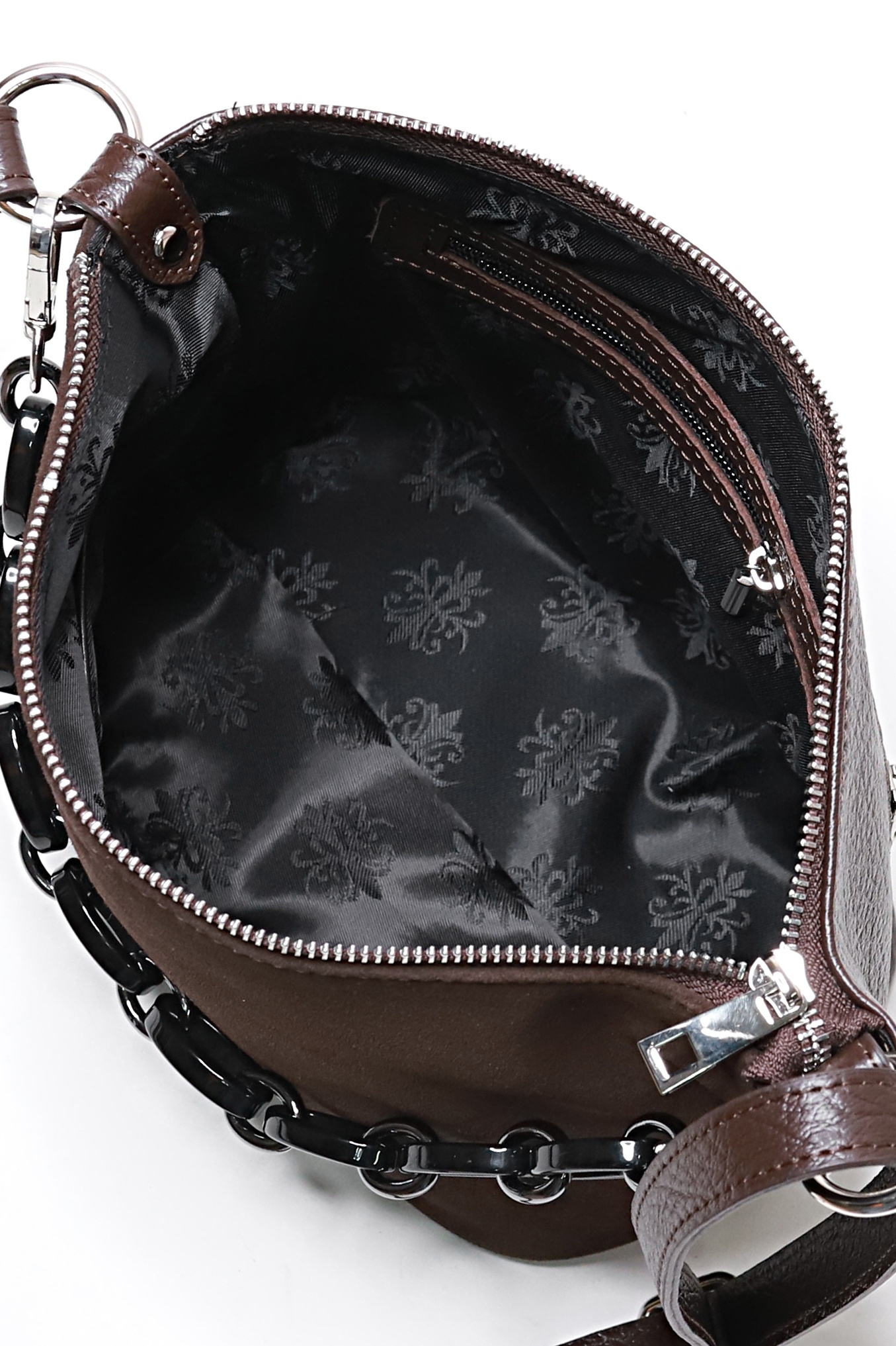 Сумка на одно отделение, закрывающееся на застежку-молнию, с несъемной регулирующейся ручкой-ремнем максимальной длины 1190+-10 мм, со съемной декоративной ручкой в виде цепи (длина 420+-10 мм), с карманом на задней стенке, закрывающимся на застежку-молнию, с боковыми держателями. Цвет фурнитуры - никель.