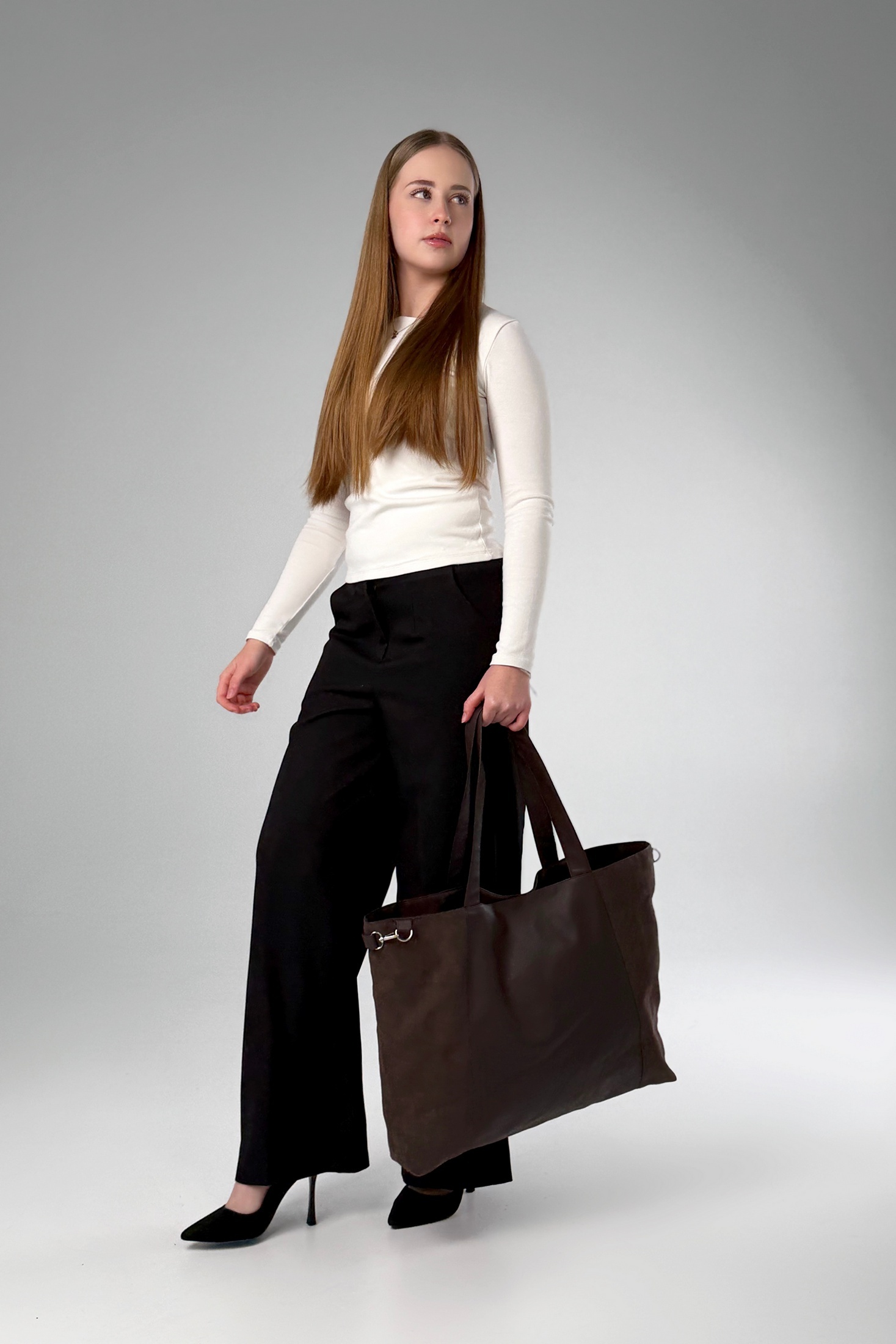 Большая, вместительная женская сумка. Внутри большое пространство без разделений. Внутри один большой карман на молнии. Стильный дизайн, большие ручки. При необходимости, карабины по бокам сумки делают ее более компактной. Снаружи расположены два вместительных кармана. Размеры сумки: ширина - 56 см, высота - 34 см, высота ручек - 30 см, глубина предмета - 12 см.