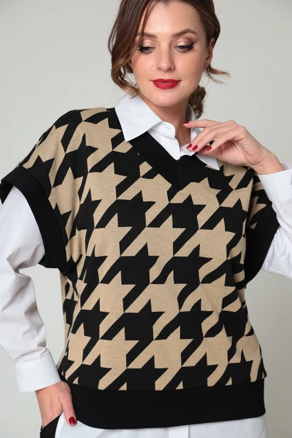 Жилет женский из трикотажного полотна с модным рисунком в крупную "гусиную" лапку. С "у" образным вырезом горловины и проймами с притачными бейками .