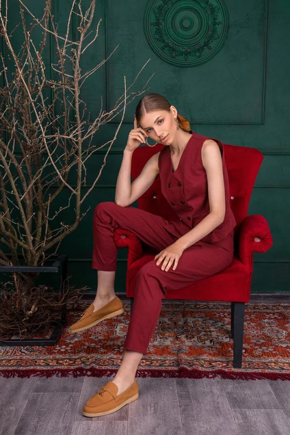 Жилет полуприлегающего силуэта. Горловина и пройма обработана обтачкой. По переду нагрудная вытачка, переходящая в подрез с имитацией кармана. Застёжка на петли-пуговицы. Низ асимметричен. По спинке две вытачки и хлястик на резинке. Длина изделия 50 см.