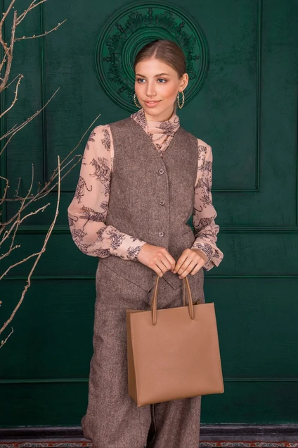 Жилет полуприлегающего силуэта на подкладке. По переду вытачка, переходящая в подрез, функциональный карман. Застёжка на петли-пуговицы. По спинке вытачки и хлястик. Длина изделия 50 см.