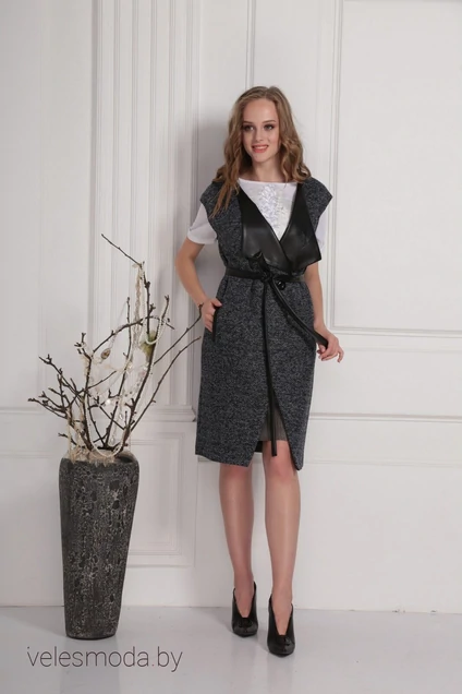 Безрукавный трикотажный жакет на подкладке с отделкой из кожи. Невероятно полезная вещь в вшем гардеробе на любой случай жизни. Для 164 длина 100, для 170 - 105.