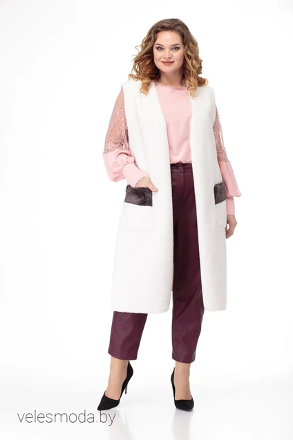 Удлинённый жилет был предложен в зимних показах уже несколько сезонов подряд и популярность его возросла! За счёт прямого кроя визуально вытягивает фигуру, корректирует непропорциональные формы, позволяет освежить и видоизменить привычный образ. Жилет без боковых швов, накладные карманы с отделочной деталью из эко-меха. Связующей деталью является пояс в области талии из эко-меха. Все срезы жилета обработаны кружевной тесьмой с изнаночной стороны. Выполнен из двух видов ткани: букле жемчужного цвета и эко-мех «тедди» белого цвета. При съемке в образе использованы модели Anelli Style: в молочном цвете – брюки 903 из эко-кожи бордо, блуза 845 розовых тонов; в цвете капучино – брюки 903 бордо и блуза 845 белая; в розовом цвете – брюки 903 коричневые и блуза 933 белая.