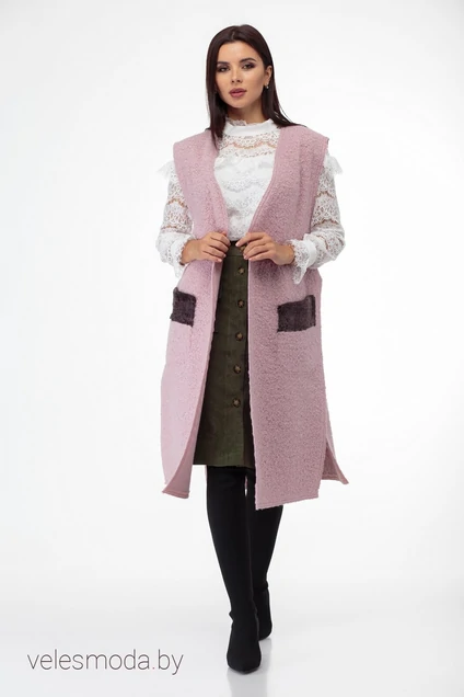 Удлинённый жилет был предложен в зимних показах уже несколько сезонов подряд и популярность его возросла! За счёт прямого кроя визуально вытягивает фигуру, корректирует непропорциональные формы, позволяет освежить и видоизменить привычный образ. Жилет без боковых швов, накладные карманы с отделочной деталью из эко-меха. Связующей деталью является пояс в области талии из эко-меха. Все срезы жилета обработаны кружевной тесьмой с изнаночной стороны. Выполнен из двух видов ткани: букле жемчужного цвета и эко-мех «тедди» белого цвета. При съемке в образе использованы модели Anelli Style: в молочном цвете – брюки 903 из эко-кожи бордо, блуза 845 розовых тонов; в цвете капучино – брюки 903 бордо и блуза 845 белая; в розовом цвете – брюки 903 коричневые и блуза 933 белая.