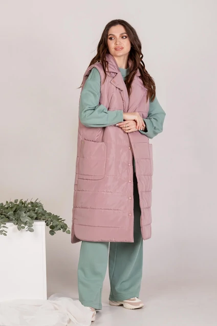 Жилет женский прямого силуэта, удлинённый, выполнен из стёганной ткани с изософтом, на подкладке. По переду накладные карманы и застёжка на 6 кнопок. Воротник отложной с лацканами, которые фиксируются кнопками.