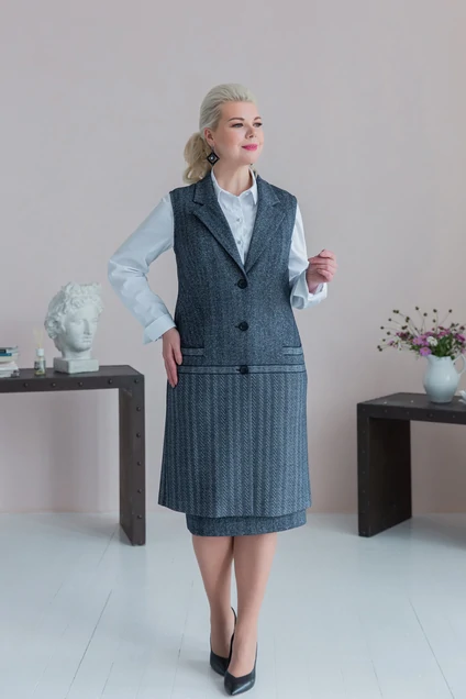 Жилет прямого силуэта с пиджачным воротником и застежкой на петли и пуговицы. По переду карманы с листочкой в шве. По спинке по низу изделия – шлица.
