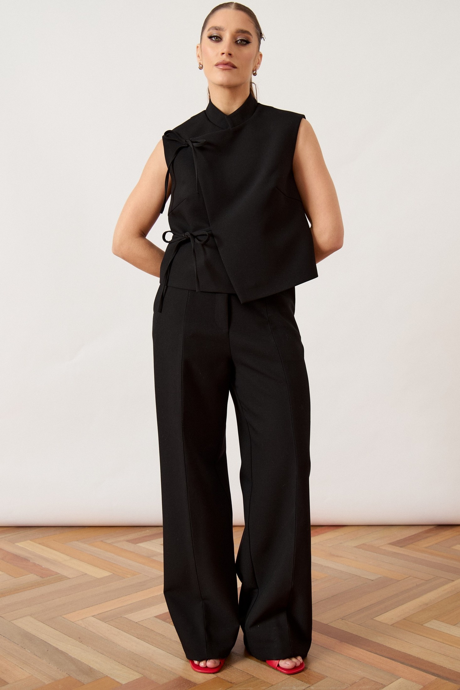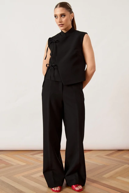 Жилет женский, прямого силуэта, выполнен из плотной костюмной ткани. Модель с воротником-стойкой и глубоким асимметричным запахом на правую сторону. Главной декоративной особенностью изделия являются две пары функциональных завязок из основной ткани, расположенных по правому борту, которые фиксируются на мягкие банты. Перед и спинка с талиевыми вытачками для обеспечения легкого прилегания. Линия плеча укорочена, пройма обработана обтачкой вчистую. Спинка со средним швом. Изделие на подкладке.