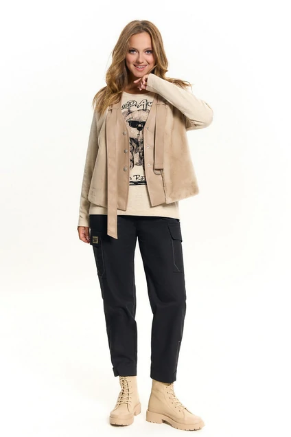 Жилет из высококачественного экомеха в комбинации с экокожей на хлопковой основе,с застежкой на кнопки и эффектным навесным декоративным поясом с пряжкой. Изделие на подкладке.