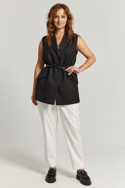 Жилет прямого кроя, из костюмной ткани черного цвета, застежка на пуговицу, по переду небольшие вытачки, по бокам изделия карманы, в комплекте съемный пояс.