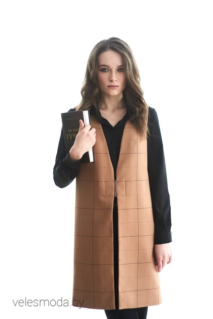 Жилет прямого силуэта на подкладке, с карманами в боковом шве. Длина жилета по спинке 89 см в 42ом размере, 91см в 48ом размере.