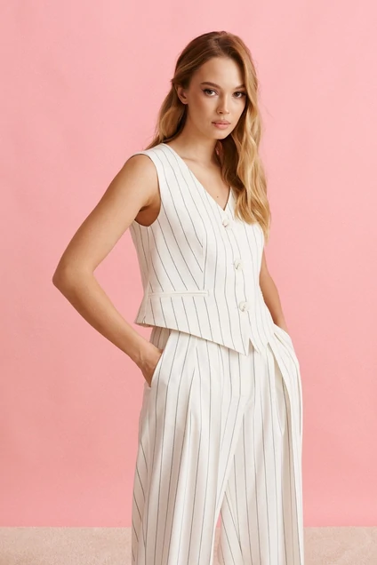 Стильный жилет прямого свободного кроя выполнен из полотна светлого оттенка с контрастными узкими вертикальными полосками. Характеристики однобортный, прямой крой, подкладка, остроугольные лацканы, прорезные карманы обманки, застежка центральная на петли - пуговицы, низ изделия по переду с фигурным низом. Длина по спинке 44 см.