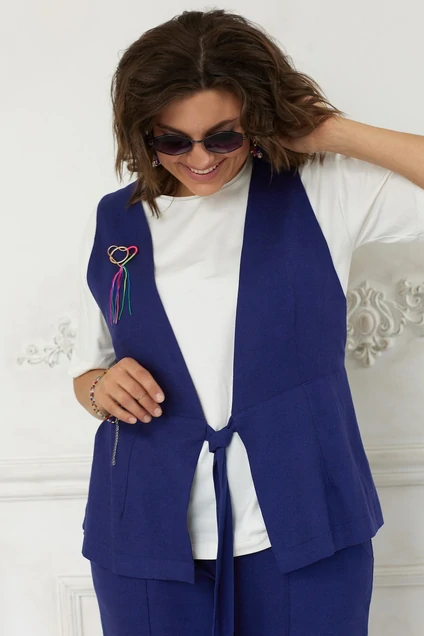 Жилет полуприлегающего силуэта, без подкладки. Застёгивается с помощью втачных поясков, выполненных из основной ткани. Декорирован яркой, элегантной брошью.