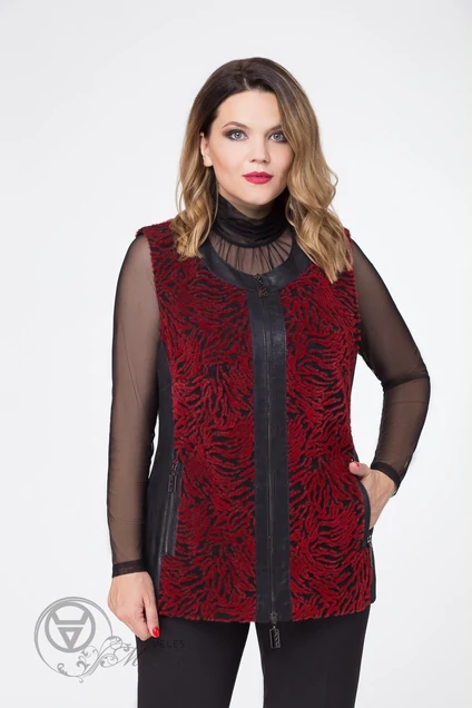 Жилет женский, полуприлегающего силуэта, с круглым вырезом горловины, с карманами, с застёжкой на металлическую тесьму-молнию. Жилет длиной до уровня линии бёдер, с притачной подкладкой. Перед с нагрудными вытачками, с рельефными швами и карманами в них с застёжкой на металлическую тесьму-молнию, с центральной планкой, бейкой горловины, бочками и планкой карманов из отделочной ткани (кожа). Спинка с рельефными швами, со средним швом. По планкам переда, горловине, карманам, проймам и бочкам переда и спинки проложены отделочные строчки ш.ш 0,1-0,2см. Длина спинки 65,5-69см