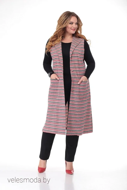 Жилет длинный из трикотажной ткани прямого силуэта с центральной бортовой застежкой на 3 прорезные петли и пуговицы. Перед с рельефами кокетками и накладными карманами. Спинка с рельефами от плечевого шва. Воротник "Апаш". Жилет без подкладки. В боковых швах рзрезы. Длина жилета по спинке 112 см.