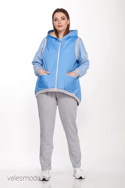 Жилет женский свободного силуэта выполнен из плащевой ткани, утеплен одним слоем синтепона на подкладке. Застежка молния по переду, на полочках накладные карманы, с капюшоном. Перед короче спинки, срез рукава и низ изделия обработаны трикотажными довязами. Длина жилета по переду 55 см, по спинке 83 см.