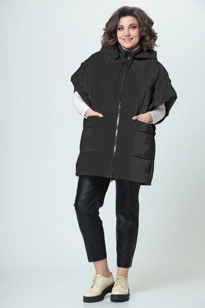 Жилет свободного силуэта с накладными карманами по переду, застежка на тесьму молния, горловина со стойкой и отстегивающимся капюшоном. Линия плеча спущена с отворотом по низу и декоративной тесьмой.