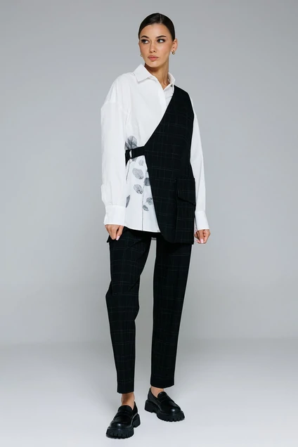 Жилет на одно плечо с застежкой на полукольца, без рукавов. По переду талиевая вытачка. По спинке рельеф. По низу жилетки на боковом шве накладной карман с клапаном. Фигурный низ. Жилет на подкладке.
