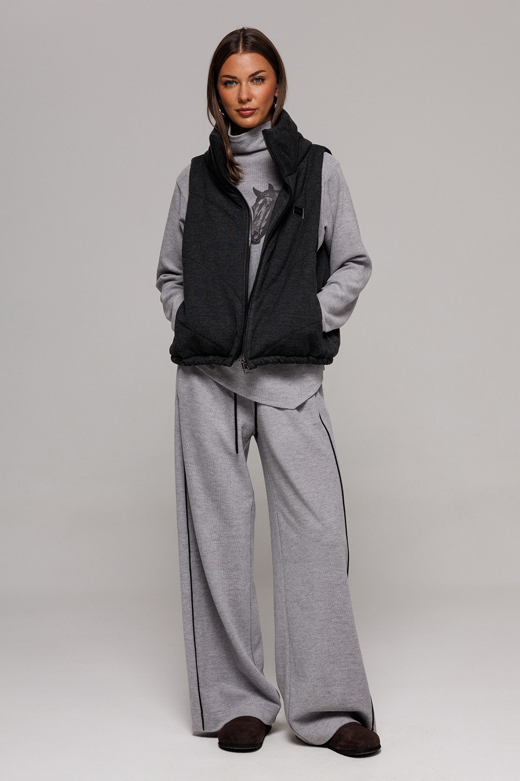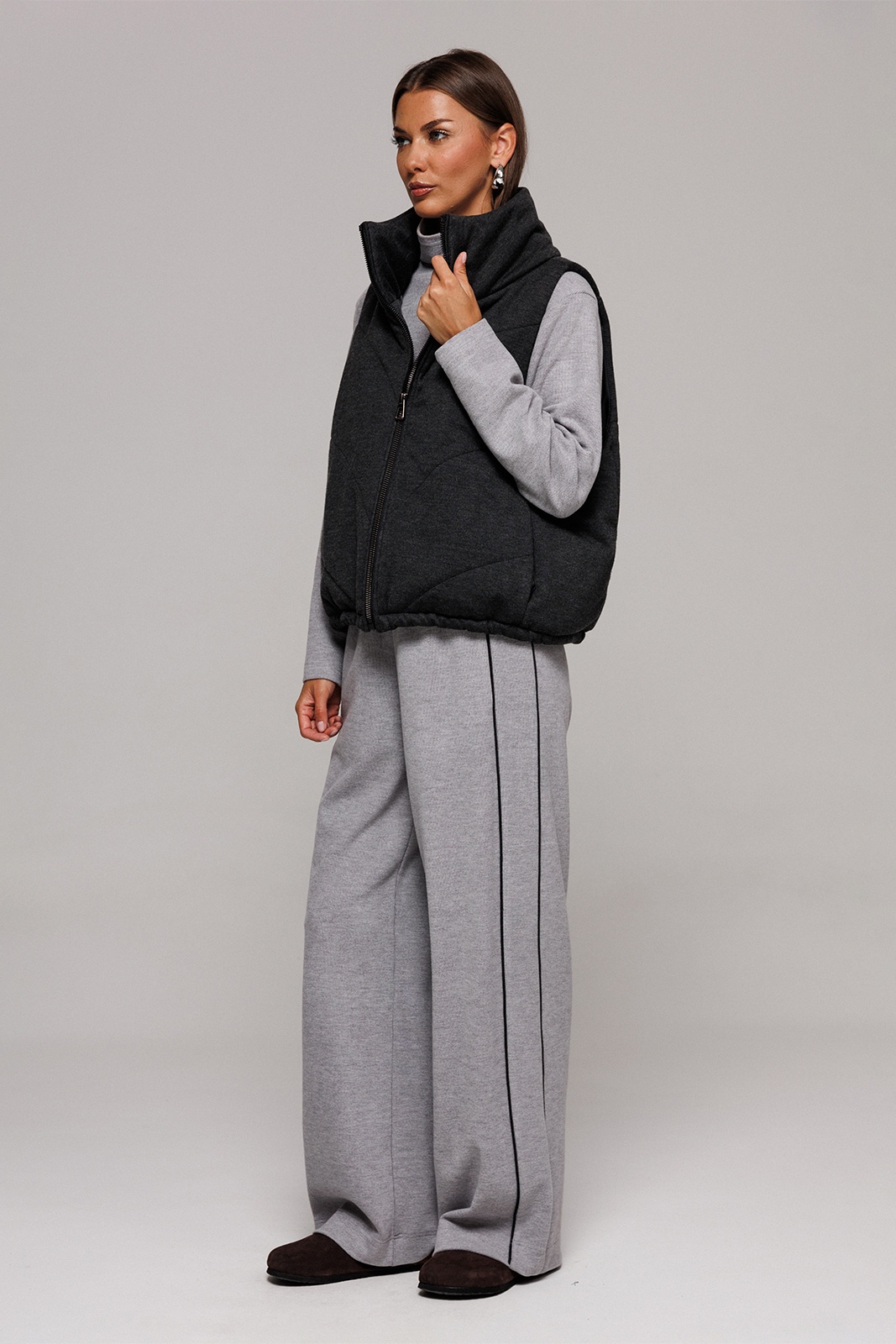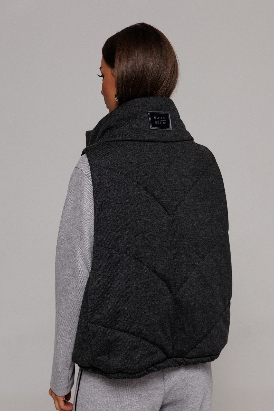 Этот стильный женский жилет представлен в темно-сером цвете, добавляя изысканности и универсальности к вашему повседневному гардеробу. Изготовлен из качественного трикотажного полотна, жилет украшен фигурной стежкой на синтепоне, что делает его не только модным, но и теплым выбором на прохладную погоду. Модель имеет свободный силуэт с легким заужением к нижней части. Практичность обеспечивается за счет полочки с центральной застежкой на тесьму-молнию, а также наличием отрезного бочка и функционального кармана в шве. Для идеальной посадки по низу жилета встроена эластичная тесьма с фиксатором на спинке. Воротник-стойка дополнен нашивкой с названием бренда "BUTER", что придает изделию дополнительный акцент. Такой жилет идеально подойдет для создания многослойных образов и станет ключевым элементом в осенне-зимнем гардеробе.