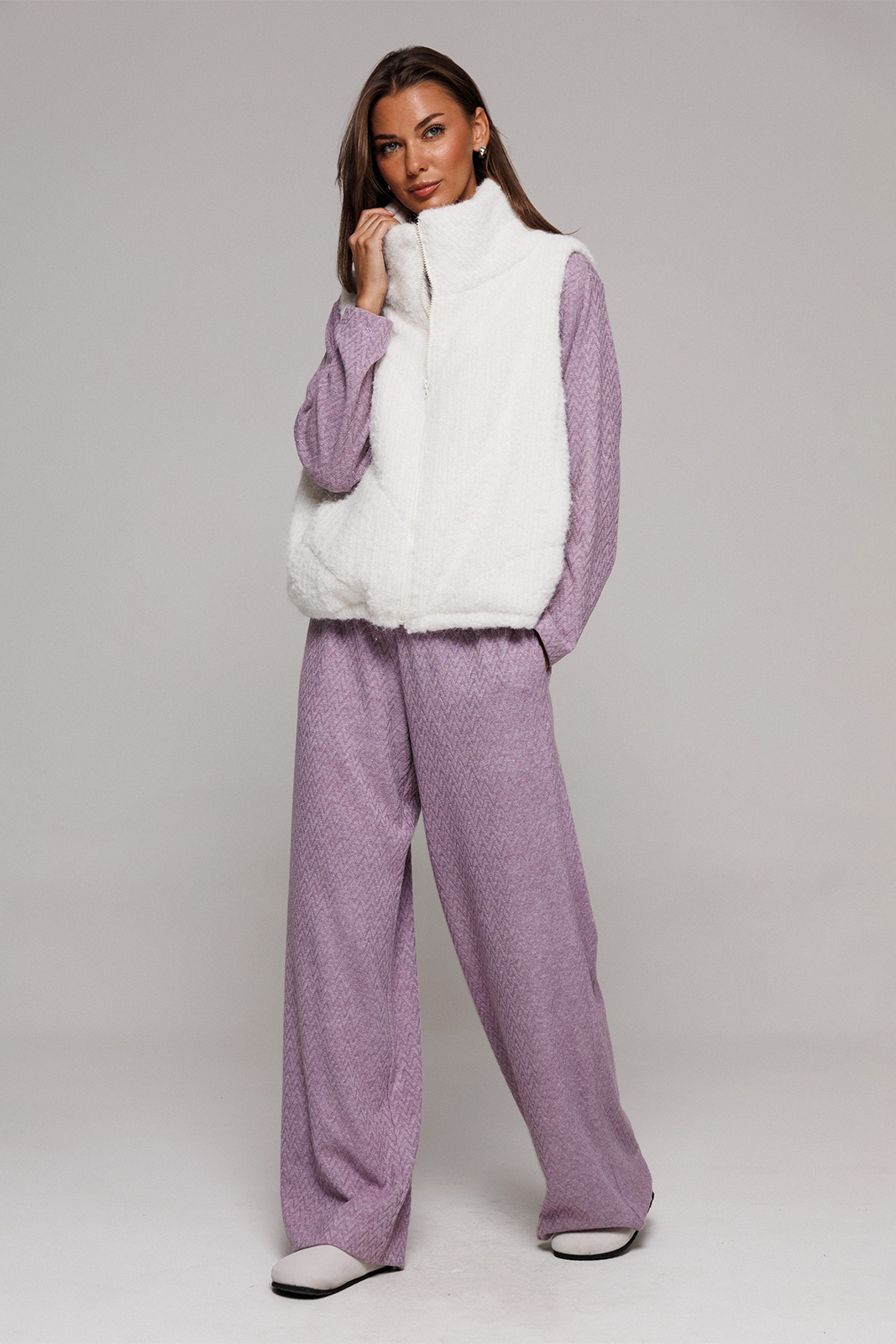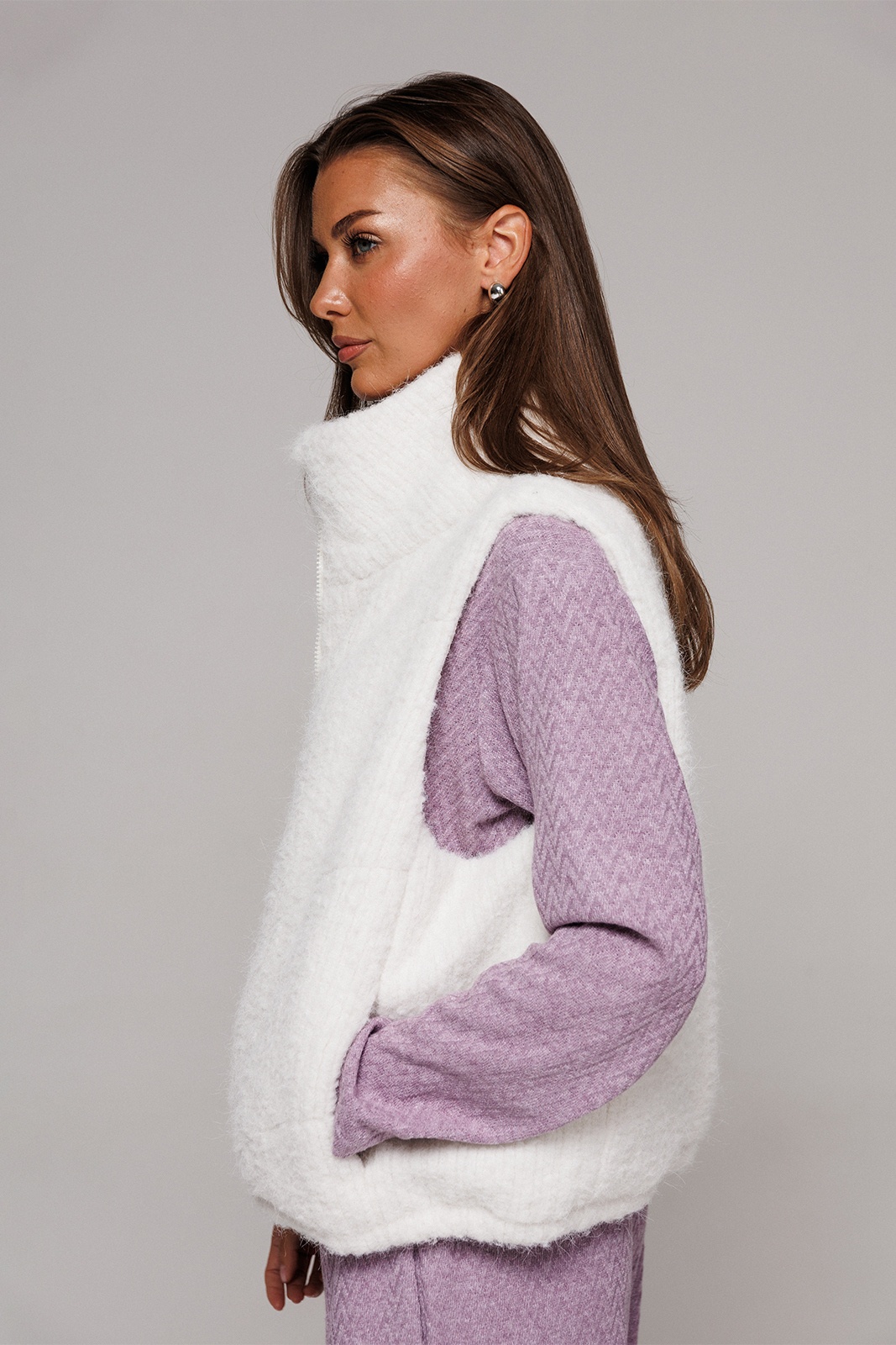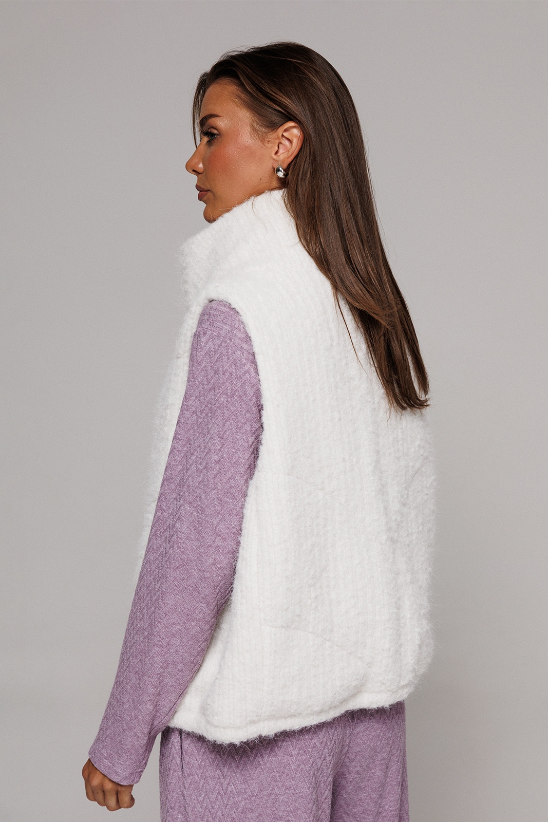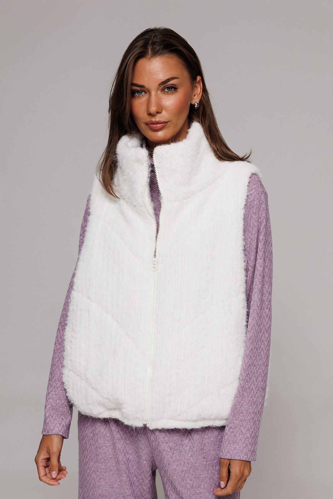 Жилет короткий свободного силуэта, слегка заужен к низу. Полочка с центральной застежкой на тесьму-молнию, с отрезным бочком и карманом в шве притачивания бочка. По низу жилета вставлена эластичная тесьма с фиксатором на спинке. Воротник - стойка. Жилет из трикотажного полотна с фигурной стежкой на синтепоне (isosoft 150г/м²) и подкладке.
