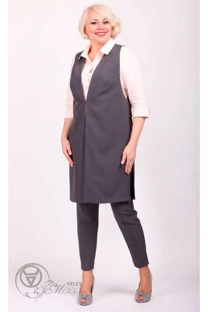 Шикарный жилет прямого силуэта на подкладке из текстиля хорошего качества. Спереди модель застегивается на крючок и петлю, по бокам – разрезы.