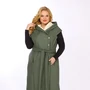 Полочка с рельефами, в которых расположены внутренние функциональные карманы. Застежка центральная на косую на 4 кнопки. Капюшон втачной. Спинка с центральным швом. В центральном шве по спинке и на рукавах функциональные шлицы на кнопках. В комплекте пояс из основной ткани.