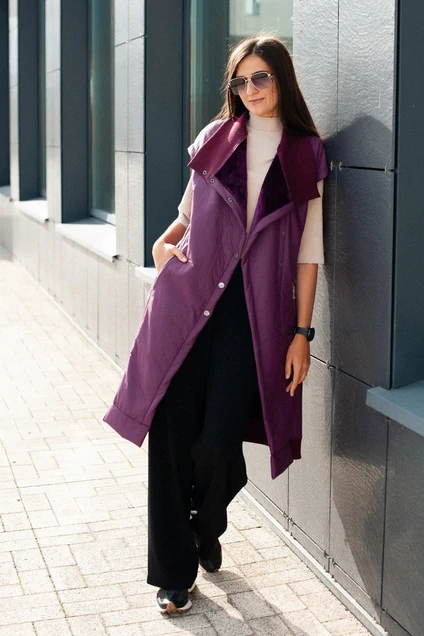 Горловина - широкая стойка из трикотажного полотна. Полочка с рельефами и внутренними функциональными карманами на молнии. Застежка центральная асимметричная на кнопки. Спинка с центральным швом. В боковых швах снизу жилета функциональные молнии. Низ изделия обработан широким трикотажным довязом.