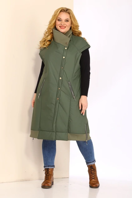 Горловина - широкая стойка из трикотажного полотна. Полочка с рельефами и внутренними функциональными карманами на молнии. Застежка центральная асимметричная на кнопки. Спинка с центральным швом. В боковых швах снизу жилета функциональные молнии. Низ изделия обработан широким трикотажным довязом.