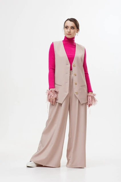 Жилет прямого силуэта с открытой застежкой на 4 прорезные петли и 4 пуговицы. Перед с прорезными карманами в рамку и фигурной линией низа. Отрезной бочок с перепадом длин между бочком и передом/спинкой. Спинка со средним швом, заканчивающийся шлицей. Жилет на подкладке. Жилет сшит из костюмной ткани.