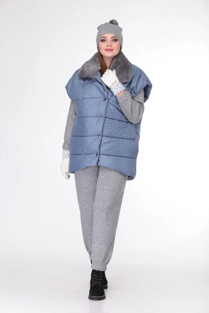 Жилет из стеганой плащевой ткани на синтепоновом утеплителе. Съемный меховой воротник. Силуэт «оверсайз». Застежка на кнопки. Карманы в боковых швах также застегиваются. Низ спинки длиннее переда.