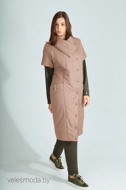 Жилетка женская полуприлегающего силуэта со смещённой застёжкой на кнопки . По переду рельефные швы от плеча до низа. В подрезе на боковой части переда обработаны карманы. Линия плеча спущена. Воротник отложной. В качестве отделки тесьма под кнопки и детали. Длина изделия 110 см., длина рукава с плечом 31-33 см.