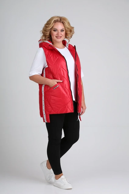 Жилетка женская полуприлегающего силуэта с центральной застёжкой на тесьму-молнию. ПО переду накладные карманы . Отрезные бочки с отделочной тесмой. Капюшон с центральной частью. В качестве отделки используется фурнитура.