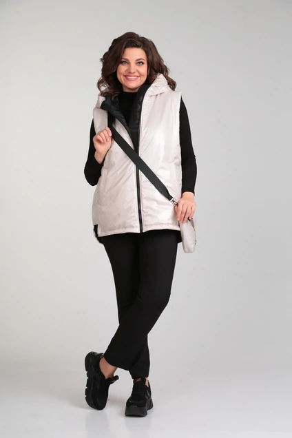 Жилетка женская, прямого силуэта с центральной застёжкой на тесьму-молнию. Спинка с закруглённым низом , по низу кулиса с резинкой и фиксатором,отрезные бочки. По переду прорезные карманы с листочкой. Капюшон с центральной частью и отделочной деталью на отворот по отлёту. Съёмная сумка из основной ткани. В качестве отделки используется отделочная строчка и фурнитура. длина по спинке 74-78 см .
