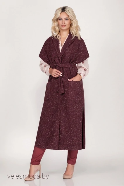 Жилет длинный из пальтовой ткани прямого силуэта с центральной бортовой застежкой на 3 прорезные петли и пуговицы. Перед с отрезными кокетками, накладными карманами с клапанами. Спинка с отрезной кокеткой. Рукава короткие цельнокроеные. Воротник пиджачного типа. На боковых швах настрочены шлевки, сквозь которые протягивается пояс. В нижней части боковых швов – длинные разрезы. Жилет на подкладке.