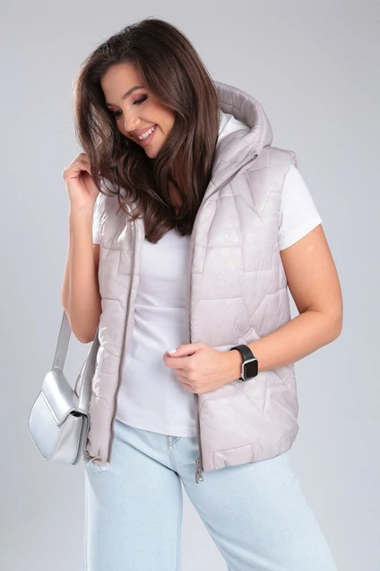 Прекрасное решение для леннего вечера. Стеганный жилет в пастельных тонах с капюшоном на воротнике - стойке, застежка молния, низ регулируемая кулиска. По полочке карманы. Длина изделия -66см