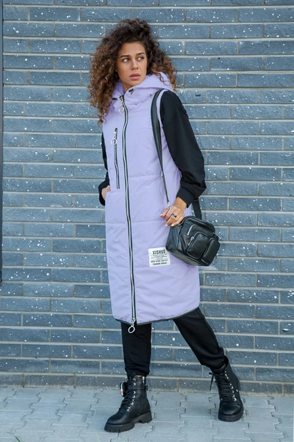 Стильный удлиненный стеганый жилет прямого силуэта, выполнен из плащевой ткани. Уникальный бельгийский утеплитель «ISOSOFT» 100 г м.кв. и мембранная подкладка «Barrier», подарит вам незабываемое ощущение легкости в движении. Воротник-капюшон на высокой отложной стойке, фигурной формы. По переду прорезные карманы с листочкой. По правой полочке груди декоративная молния. Низ жилета слегка присобран на окантовку. Застежка молния.