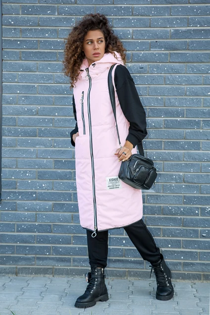 Стильный удлиненный стеганый жилет прямого силуэта, выполнен из плащевой ткани. Уникальный бельгийский утеплитель «ISOSOFT» 100 г м.кв. и мембранная подкладка «Barrier», подарит вам незабываемое ощущение легкости в движении. Воротник-капюшон на высокой отложной стойке, фигурной формы. По переду прорезные карманы с листочкой. По правой полочке груди декоративная молния. Низ жилета слегка присобран на окантовку. Застежка молния.
