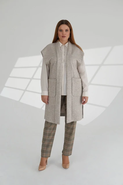 Трикотажный жилет из высококачественного полотна с цельнокроеным воротом. По переду изделия накладные карманы, по бокам жилета разрезы. Рукав спущенный. Длина жилета - 97 см.