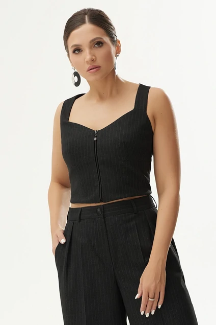 Стильный укороченный жилет полуприлегающего силуэта, выполнен из костюмной ткани с вискозой. Перед с фигурным вырезом горловины, застежкой на тесьму-молния и отрезным лифом. Спинка со средним швом. Жилет на подкладке. С этим жилетом рекомендуем брюки Elady 4297, жакет Elady 4303.