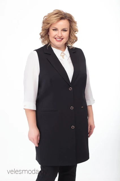 Удлиненный жилет полуприлегающего силуэта, с отложным воротником и лацканами пиджачного типа, на подкладке, из костюмно-плательной ткани средней плотности, по переду вертикальные талиевые вытачки и имитация карманов, по спинке средний шов и рельефы. Застежка на 3 петли и пуговицы.