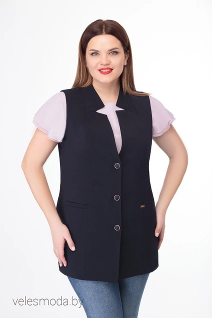 Удлиненный жилет полуприлегающего силуэта из костюмно-плательной ткани средней плотности. Фигурный вырез по горловине. Спереди вертикальные нагрудные вытачки и имитация карманов, по спинке средний шов. Застегивается по переду на пуговицы.