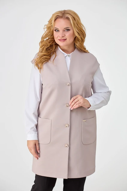 Удлиненный жилет полуприлегающего силуэта, на подкладке, из плотной костюмно-плательной ткани. По переду нагрудные вытачки и накладные карманы, по спинке средний шов. Застегивается на пуговицы.