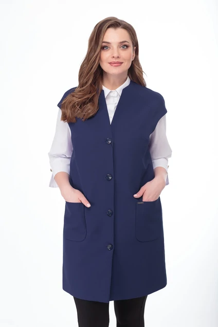 Удлиненный жилет полуприлегающего силуэта, на подкладке, из плотной костюмно-плательной ткани. По переду нагрудные вытачки и накладные карманы, по спинке средний шов. Застегивается на пуговицы.