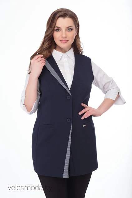 Удлиненный жилет, полуприлегающего силуэта, на подкладке, из костюмно-плательной ткани средней плотности, по переду вертикальные талиевые вытачки и имитация карманов, по спинке средний шов. Застегивается на 2 пуговицы.